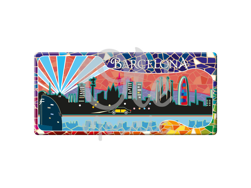 Imán metálico con una colorida panorámica de Barcelona, de 11 cm. Este imán presenta una vibrante representación de la silueta de la ciudad, con monumentos icónicos como la Sagrada Familia y la Torre Agbar destacados sobre un fondo dinámico de mosaicos brillantes. La inclusión de un coche y rayos luminosos de colores añade un toque moderno, mientras que el texto «Barcelona» resalta la esencia del lugar. Ideal para recordar tu visita o como regalo.