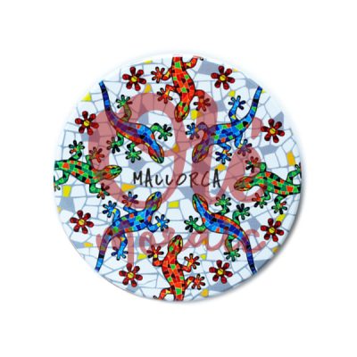 Este posavasos de cerámica es una vibrante representación del encanto natural de Lanzarote, ideal para quienes buscan souvenirs auténticos y de calidad. Con un diseño que destaca la fauna de la isla, este posavasos presenta numerosas salamandras en tonos azul, verde y rojo que parecen cobrar vida sobre un fondo de mosaico brillante. Las flores coloridas y estilizadas que acompañan a las salamandras, junto con el texto «LANZAROTE», añaden un toque de frescura y alegría, evocando los paisajes únicos y la rica biodiversidad de esta hermosa isla canaria.