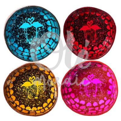 4 Bols de coco de 13 x 6 cm. Flamenco. Azul, rojo, amarillo y fucsia.