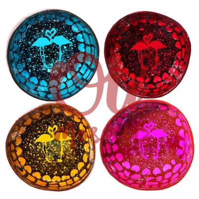 4 Bols de coco de 13 x 6 cm. Flamenco. Azul, rojo, amarillo y fucsia.