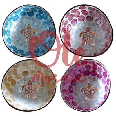 4 Bols de coco de 13 x 6 cm. Azul, rosa, naranja y blanco. Tortuga.