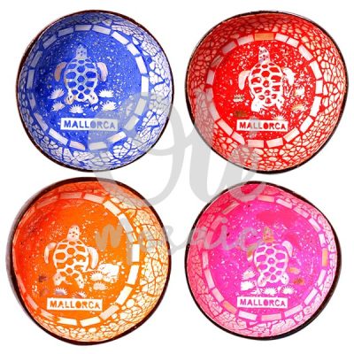 4 Bols de coco de 13 x 6 cm. Tortuga. Azul, rojo, naranja y rosa. Mallorca.