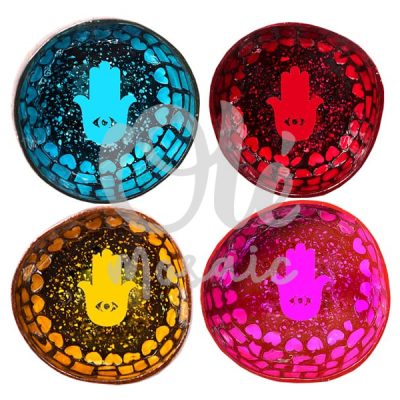 4 Bols de coco de 13 x 6 cm. Mano de Fátima. Hamsa.