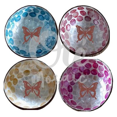 4 Bols de coco de 13 x 6 cm. Diseño en Mosaico. Mariposa.