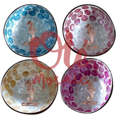 4 Bols de coco de 13 x 6 cm. Caballito de mar. Diseño en Mosaico. Mallorca.