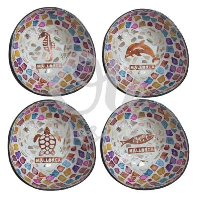 4 Bols de coco de 13 x 6 cm. Animales del mar. Mosaico. Mallorca.
