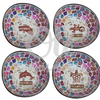 4 Bols de coco de 13 x 6 cm. Animales del mar. Delfín, tortuga y lagartija. Menorca.