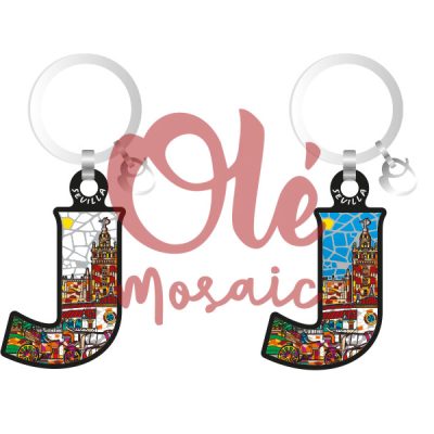 Los llaveros de la letra J de OLE MOSAIC están diseñados en madera y decorados con mosaico moderno y alegre. Son ideales para nombres como Javier, Julia, Jorge, Juan, Joaquín, Judith, Jimena, Julieta, Josué o Joana, y están disponibles como recuerdos de ciudades como Barcelona, Madrid o Sevilla.