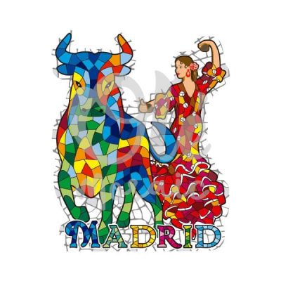 Imán de cerámica. Toros. Verde, azul y rojo. Madrid. Blanco.